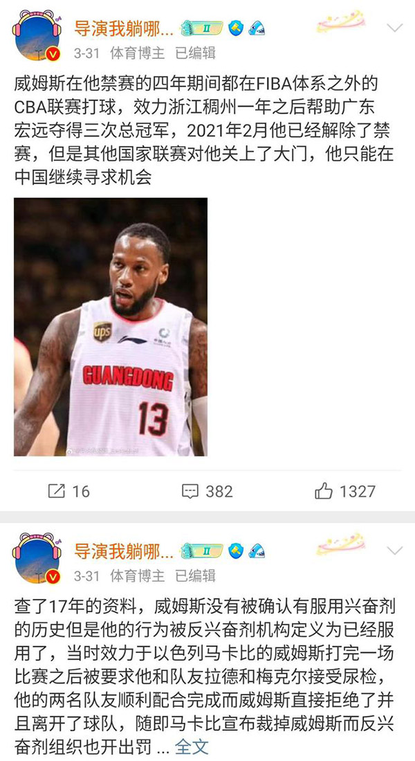 可惜的是知名篮球媒体人曾博安的报道并没有让“阿舜说球Sean”等人迷途知返,他们依旧拿着威姆斯曾经逃避药检的事情来说事,那架势大概率是想说威姆斯如果没有涉及兴奋剂,当年为什么要跑呢?甚至,他们还认为就是因为有这一段历史,威姆斯才会在CBA无球可打的时候宁可去打超三都不去欧洲试试。