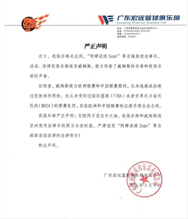 在通报上,广东宏远表示:经核查,威姆斯效力欧洲联赛和中国联赛期间,从未逃避或拒绝过经批准的药检,也从未受到过国际篮联(FIBA)或者世界反兴奋剂机构(WADA)的禁赛处罚,其在欧洲和中国联赛的注册手续合法合规。