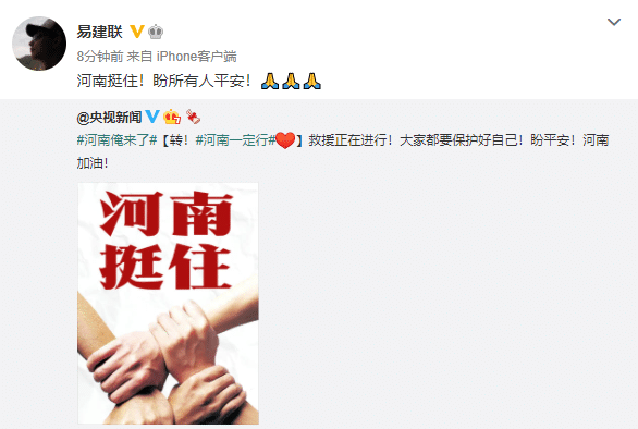 广东东莞大益队球星易建联转发央视新闻的口号,并且写道:河南挺住!盼所有人平安!(3个祈祷表情)