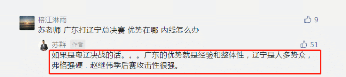 有球迷提问,“苏老师,广东打辽宁总决赛优势在哪里,内线怎么办”。而苏群老师回应,“如果辽粤决战的话,广东队的优势是经验和整体性,辽宁队人多势众,弗格强硬,赵继伟季后赛攻击性很强”。