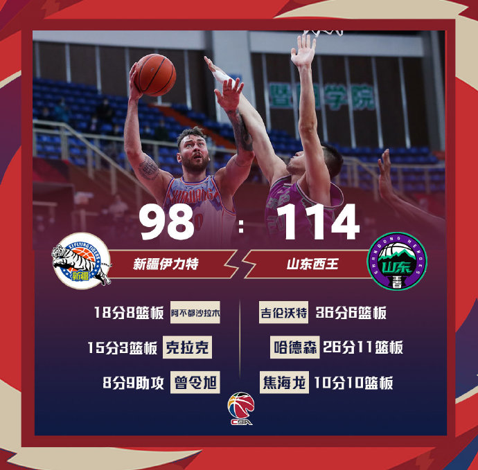 山东114-98轻取新疆 吉伦沃特32+6 哈德森26+11 阿不都18+8