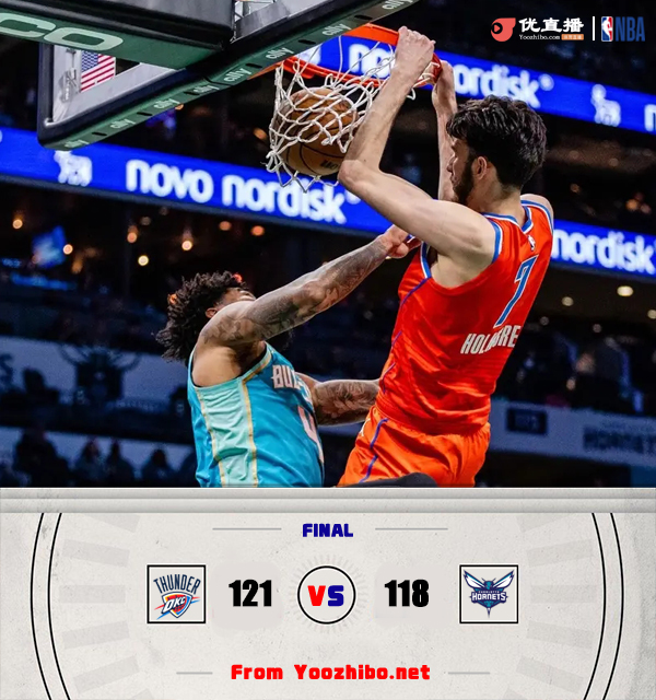 24直播网4月8日讯 黄蜂今日坐镇主场迎战雷霆,雷霆这边亚历山大和杰威因伤继续缺席比赛。首节开局雷霆在基迪连拿7分的带领下以13-4开局抢占先机,不过即便如此开局他们依旧无法守住优势,黄蜂随即找回状态迅速反扑追近比分;不过雷霆在次节优势被抹平的情况下及时找回状态,他们多点开花轰出一波16-3的攻势一举拉开两位数领先并奠定半场10分的领先优势。休息归来双方重新陷入拉锯战,不过黄蜂进入轮换后送出一波22-9的攻势一举追至1分燃起希望;末节雷霆依靠连续三分短暂拉开7分领先,然而随后突然熄火被黄蜂打出13-2的攻势丢掉主动权;不过最后时刻维金斯和乔接连命中三记关键三分为雷霆夺回领先奠定胜局。最终,雷霆客场险胜黄蜂拿下比赛。