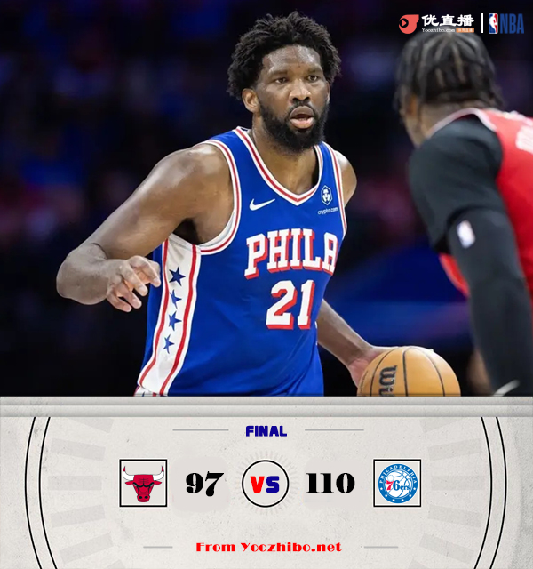 24直播网1月3日讯 NBA常规赛76人主场对阵公牛,两队才刚刚交过手,上场比赛76人在恩比德缺阵的情况下不敌公牛,目前76人排在东部第三,公牛排在东部第十。比赛开始后76人迅速打出状态,他们全面开花迅速将分差拉开,尤其是外线三分弹如雨下,公牛则是依旧进攻端依旧慢热,首节76人43-18取得25分领先。第二节76人攻势依旧凶猛,恩比德单节砍下15分带队继续扩大优势。易边再战,公牛在进攻端找到节奏略微将分差缩小,不过无奈此前分差太大,第四节沦为垃圾时间,不过76人最后8分多钟一分未得,最终76人110-97轻松复仇公牛。