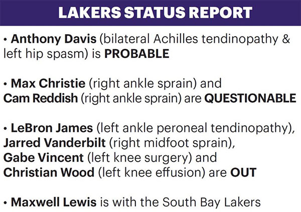 安东尼-戴维斯(双侧肌腱炎&左臀痉挛)大概率出战(75%可能性出战);马克斯-克里斯蒂(右脚踝扭伤)、卡姆-雷迪什(右脚踝扭伤)出战成疑(50%可能性出战)。