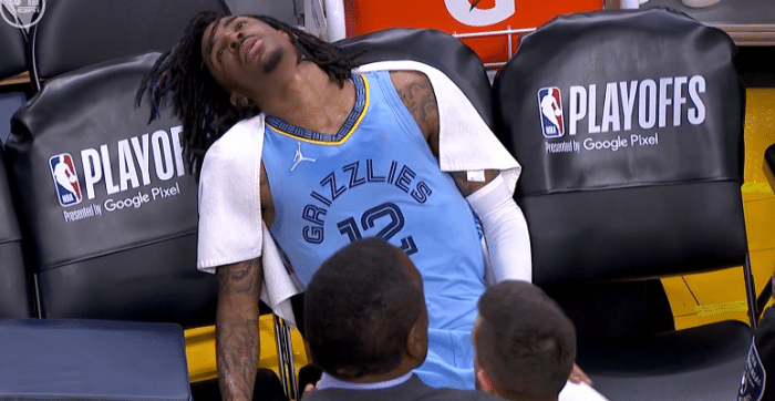 末节6分19秒,莫兰特运球遭遇包夹,期间普尔撞倒莫兰特的膝盖,之后抢球时还拉拽了莫兰特的右膝;莫兰特罚球时有些站不住,之后一瘸一拐走到场边,坐在替补席时十分沮丧,怒砸坐垫宣泄情绪;比赛还没结束,莫兰特提前返回更衣室。
