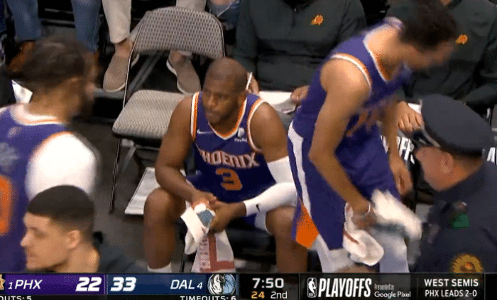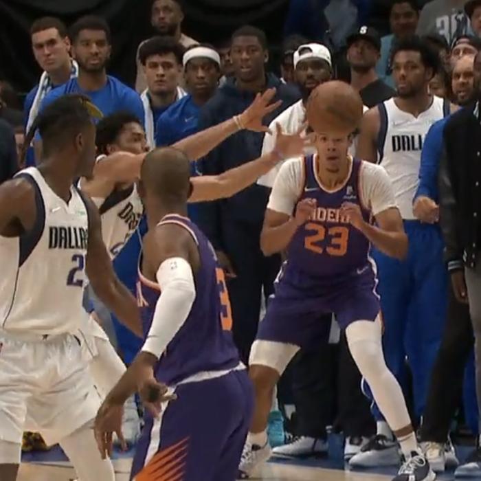 保罗37岁生日夜就像迷失自我似的,半场7次失误距离季后赛生涯单场8次失误仅差1次,不过第二节后半段,当太阳落后到14分时,保罗中投得分,外线三分也有,连续得分打停独行侠,期间布里奇斯吃到技术犯规,东契奇带队稳住局面,保罗防守时被东契奇撞倒,卢卡夸张模仿,质疑保罗假摔。