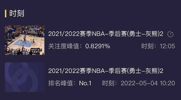 在国内,勇士和灰熊系列赛的关注度也极高,G2的对决中灰熊依靠着最后阶段莫兰特的爆发惊险取得胜利,收视率最巅峰时刻出现在末节最后阶段,高达0.8291%,同时间段排名全国第一。