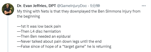 另一医学专家Jeff Stotts发推写道:西蒙斯接受微创切除手术,减轻神经压迫,有些球员接受椎间盘相关手术仍表现出色,比如霍华德和加里纳利。