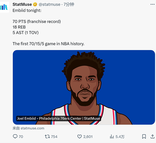 恩比德一战刷爆纪录——单场70分超越张伯伦(68分)成为76人队史单场得分王;成为现役第4位70分先生,NBA历史上第9位70分先生,更是成为史上第一位单场至少70分15篮板5助攻的球