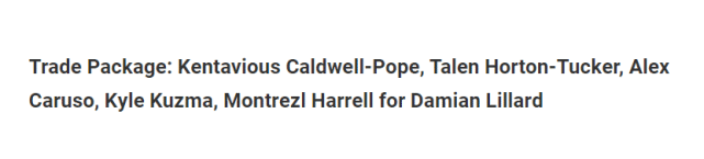 日前,美媒Fadeaway World就为湖人支招,列出了一套5换1的交易方案:湖人送出波普、库兹马、哈雷尔、卡鲁索和霍顿-塔克,来换回利拉德。