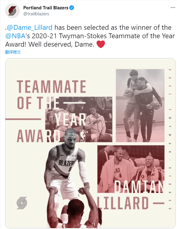 来源:24直播网06-04 16:1524直播网讯 北京时间6月4日,NBA官方正式公布2020-2021赛季又一项年度大奖,开拓者球星利拉德获得特威曼-斯托克斯年度最佳队友大奖,开拓者官方第一时间恭喜利拉德,晒照并且发推写道:实至名归。