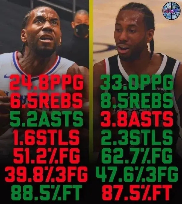 反观快船那边的当家老大,真是要了命,机器人到季后赛就升级,4场比赛场均能狂轰33分8.5板3.8助1帽,投篮命中率62.7%,三分命中率47.6%,罚球命中率87.5%,真实命中率高达74.1%。