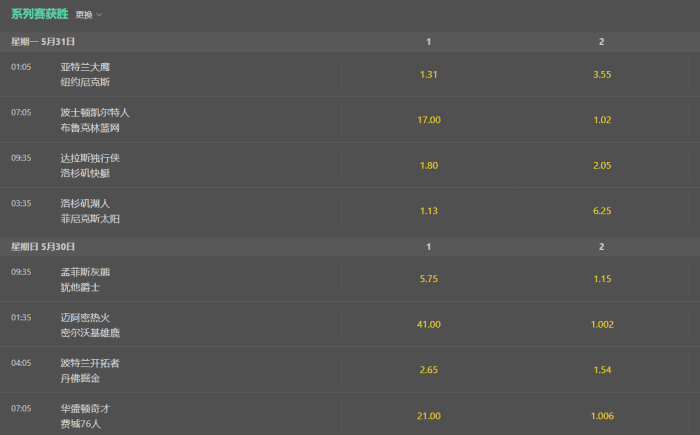 来源:24直播网05-30 14:3124直播网讯 昨天相关机构更新了NBA首轮系列赛的最新赔率。0-3落后的热火几乎已经被宣判提前出局,雄鹿取胜概率高达1:1.002。0-2落后的奇才,费城的取胜概率也是1:1.006!而绿军虽然主场扳回一城,但依然非常不被看好,仅好于热火和奇才。而独行侠和快船的对决,看起来会最为激烈。