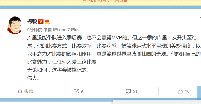 是的,输掉这场比赛,意味着库里基本不会有机会去争夺MVP,毕竟季后赛是最低的战绩门槛。但就像杨老师所说,库里的比赛魅力让无数人爱上篮球爱上这项运动,他的影响力是巨大的。萌神在33岁的年龄打出了一个现象级的常规赛,创造了无数历史纪录。再次向库里脱帽致敬!下赛季等到汤普森回归,相信水花兄弟会带领勇士重新向总冠军发起冲击。