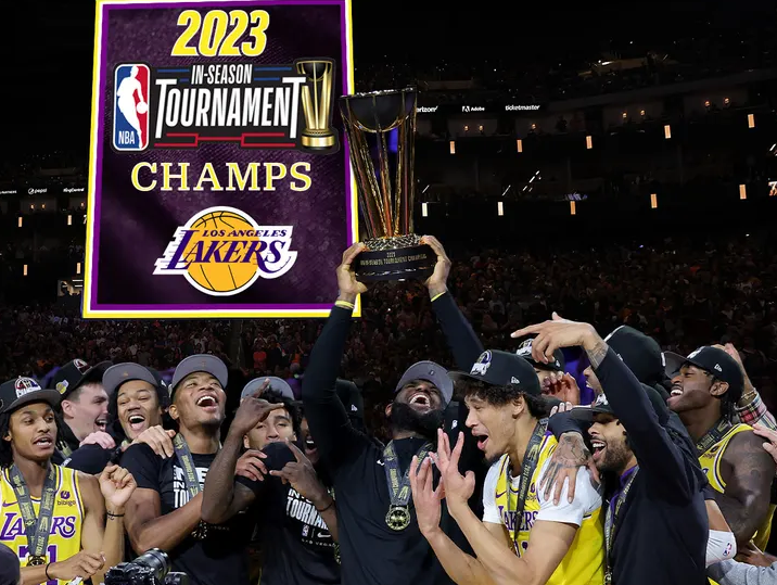 NBA首届季中锦标赛,詹姆斯和浓眉带领湖人7胜0负夺得冠军,湖人众将获得50万美元奖金,詹眉双双全票入选季中赛最佳阵容,詹姆斯更是夺得首届季中赛MVP奖杯。