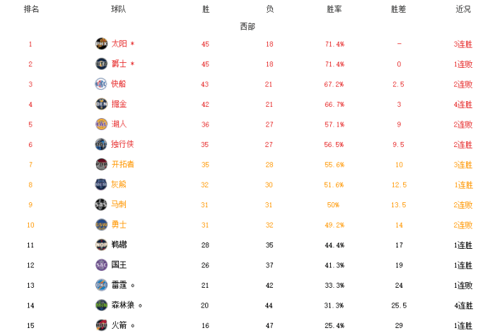 来源:24直播网05-01 16:1424直播网讯 北京时间5月1日NBA常规赛进行了8场比赛,其中有7支西部球队出战,其中包括了太阳21分大胜爵士,登顶联盟第一;马刺一度领先32分,却通过加时赛被凯尔特人逆转;灰熊大胜魔术、开拓者击败篮网、詹姆斯复出湖人不敌国王;接下来我们一起看看西部最新排名: