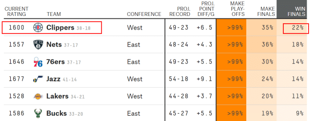 乔治克服了伤病的问题,状态越来越好,而快船也在他的率领下达成6连胜,成为联盟当下连胜场次最多的球队。数据网站FiveThirtyEight公布了最新的夺冠概率,快船(22%)已经超越篮网(18%),升至第一位。随后依次是费城(14%)、爵士(14%)、湖人(11%)和雄鹿(9%)。失去穆雷的掘金,夺冠概率暴跌,目前只剩2%,和凯尔特人并列第八。