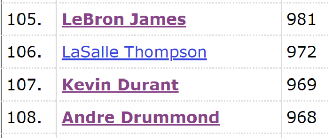 第三,杜兰特的盖帽数,也有望达到新的高度。生涯至今,杜兰特累计盖帽969次,排名历史第107位,距离第106位的拉赛勒-汤普森(972次)还差3次。而排在第105位的是勒布朗-詹姆斯(981次),杜兰特的生涯盖帽数已经逼近詹姆斯了。