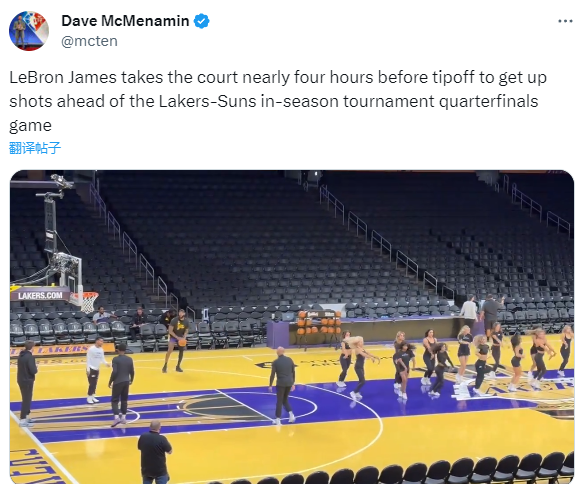 距离比赛开打还差将近4个小时,詹姆斯便提前入场训练——湖人啦啦队正在球场上排练舞蹈,詹姆斯早早换上训练服,来到球场上进行投篮训练,足以看出詹姆斯对待这一场比赛的态度。