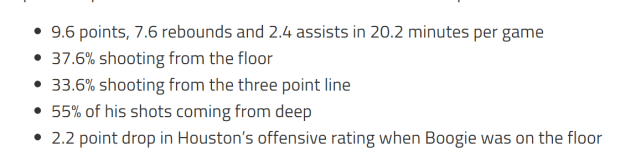 美媒还列出了考辛斯本赛季效力火箭的数据。他场均出场20.2分钟,贡献9.6分7.6篮板2.4助攻,投篮命中率只有37.6%,三分命中率33.6%。55%的出手来自三分线外,当考辛斯在场时,火箭的进攻效率下降2.2分。