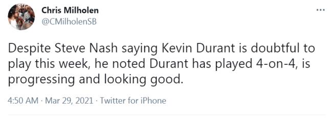 杜兰特情况也好转了,他在2月14日对阵勇士的比赛中遭遇了左腿筋轻微拉伤,随后缺席至今。纳什表示杜兰特今日参加了了队内4对4训练,但预计还将因腿筋伤势再缺席至少一周。他表示如果是季后赛杜兰特已经复出了,但球队现状很好没必要冒险,这完全可以理解,完全体篮网就要出现了!