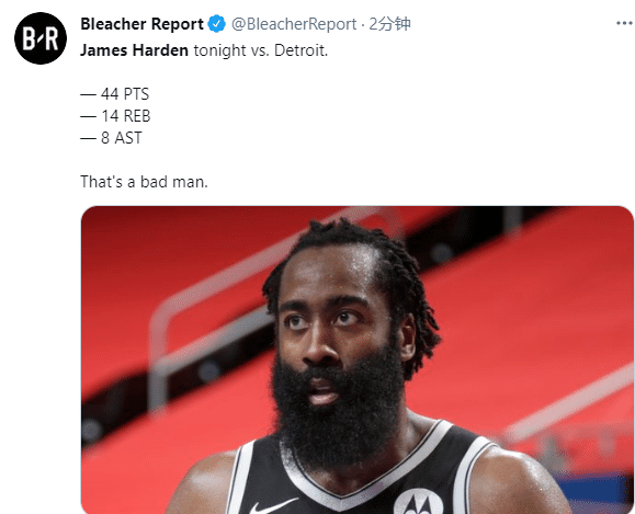 赛后美媒盛赞哈登MVP,露天看台则是调侃哈登是一个坏男人;著名詹黑斯基普-贝勒斯发推写道:没有杜兰特和欧文,哈登轰下44+14+8带队赢球,哈登已经是MVP了。
