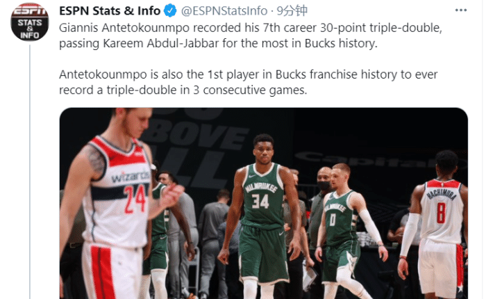 另外,这是字母哥生涯第7次砍下30分的三双,超越贾巴尔的6次同样升至雄鹿队史第一!一战创造两大队史纪录!
