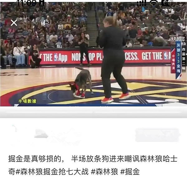 可是掘金队这边真的是着死了,半场比赛结束的时候,当场上来到了中场表演环节,掘金队竟然安排了一个表演环节,那就是掘金队的工作人员牵着一只狗来到了场地中间进行表演,在工作人员的一通指令下,小狗很听话的完成了演出,可是问题是,掘金队选的这只小狗怎么看都像森林狼的LOGO,再加上他们的对手是森林狼,掘金队在半场安排这个听话小狗的表演嘲讽的意思就非常的明显了。