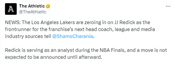 雷迪克目前是最有可能成为湖人新任主帅的人选,湖人对雷迪克成为一名精英级别的NBA教练的潜力非常着迷。由于雷迪克将在总决赛中担任评论员和分析师,NBA内部普遍认为,湖人预计将在总决赛后官宣这一决定。