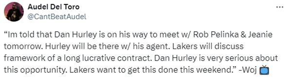 据woj最新报道,赫尔利和他的经纪人,他们明天将和湖管坐下来讨论具体的交易内容,以及赫尔利和湖人之间的合作关系。湖人一直致力于将赫尔利从康大挖走。这将会是一场有吸引力的谈判。对赫尔利来说,这是他为自己赢得长期且高薪的合同的机会,他对自己与湖人的谈话非常谨慎。我确信这将会是一个以某种方式很快结束的过程。