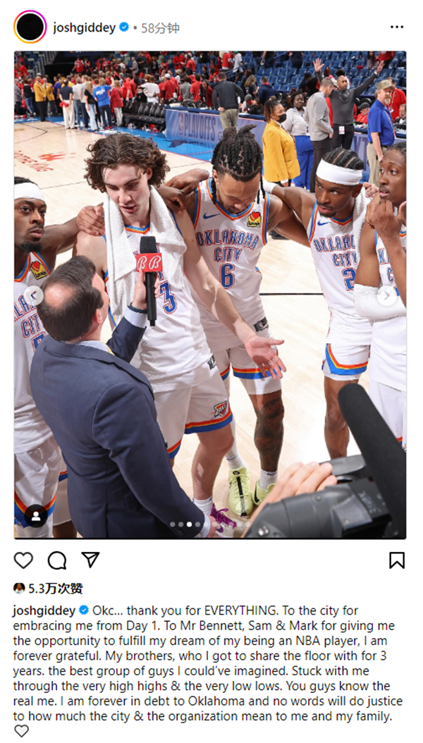 基迪发表长文表达了对雷霆的感谢:雷霆,感谢你的一切。 从我来到这里的第一天,这座城市就拥抱了我。 对于班内特先生(雷霆老板)、山姆和马克给我机会,实现了我成为一名NBA球员的梦想,我永远都感激不尽。 我的兄弟们,我们一起共事了3年,这是我能想象到的最棒的一群家伙。你们陪我度过高潮和低谷,你们了解真正的我。 我永远都亏欠于俄克拉荷马,没有任何言语可以完美阐述这座城市和球队对我和家人意义。