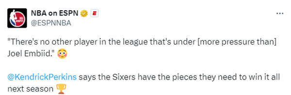 对于恩比德获得乔治这样的冲冠帮手,今日名嘴帕金斯在节目中表示:恩比德将成为联盟中压力最大的球员,他将面对塔图姆之前面对的那种压力,联盟中没有球员压力比他更大。你看看联盟中大个子的名单,浓眉有一枚总冠军戒指,约基奇有一个总冠军,字母哥也有一个总冠军。当你想到那些球队,雄鹿进行了必要的操作,引进了争冠的拼图,我们也知道掘金也为约基奇引进了帮手。76人今年休赛期也做到了同样的事情,最近两年他们签下了纳斯,续约了马克西,引进了乔治,等等,恩比德已经拥有了争冠所需要的拼图,新赛季他是联盟中压力最大的球员。