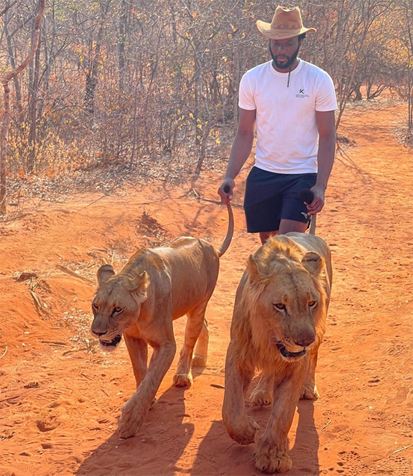 阿丘瓦身穿黑色短裤和白色T恤,戴着一顶牛仔帽,抓着两只狮子的尾巴在野外散步,就像遛狗似的;阿丘瓦玩得真大,这操作令无数网友心惊胆战;见过NBA球员养狗、养蛇以及养鳄鱼,像阿丘瓦这样遛狮子,还真是太少见了。