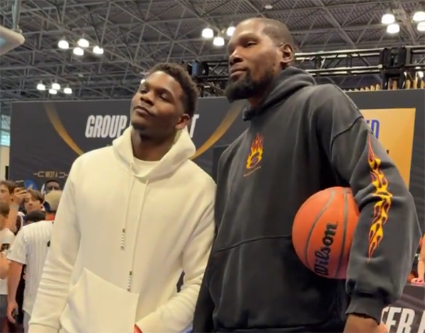 太阳球星凯文-杜兰特和森林狼球星安东尼-爱德华兹一起参加了由Fanatics公司举办的球迷活动,活动期间主持人问杜兰特:这几天和爱德华兹在一起的感觉怎么样?”杜兰特:“伙计,我管他叫‘小山羊’(Baby GOAT),你懂我的意思。“