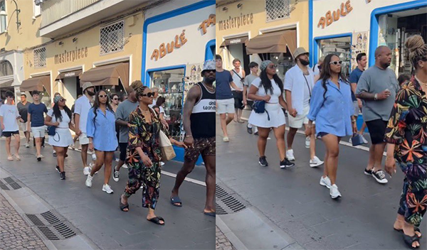 现在詹姆斯夫妇已经来到了意大利的卡普里岛,牵手爱妻漫步街头,老詹穿着短裤、背心和拖鞋,一身轻松和惬意,据悉,火箭球员范弗利特就在老詹的后面。