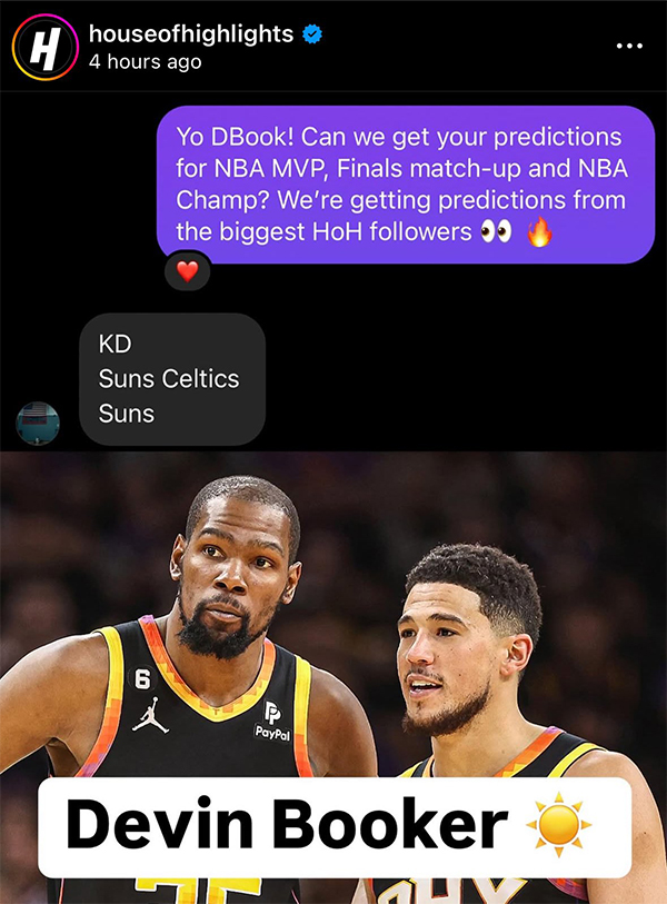 来源:24直播网10-08 12:4324直播网讯北京时间10月8日,美媒House of Highlights晒出布克对新赛季的一些预测,布克预测杜兰特夺得常规赛MVP,太阳和凯尔特人会师总决赛,最终太阳夺得总冠军。