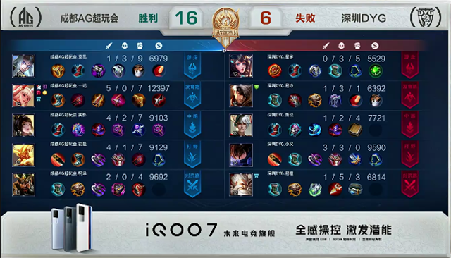 开局中路团战,扁鹊拿下一血。1分40秒太乙真人被击杀。2分钟马可波罗推掉下路一塔。2分24秒云缨拿下暴君。2分40秒赵云拿下主宰。5分10秒马可波罗推掉上路一塔。6分10秒中路团战,深圳DYG打出0换2。8分16秒中路团战,成都AG超玩会团灭深圳DYG,马可波罗拿下四杀。8分47秒成都AG超玩会推掉水晶拿下本场比赛胜利。