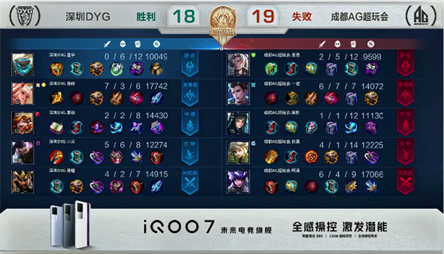 开局深圳DYG3Buff开局。1分45秒深圳DYG强攻上路一塔,镜拿下一血。2分37秒镜拿下主宰。2分48秒深圳DYG入侵野区,不知火舞被击杀。2分50秒娜可露露拿下暴君。3分20秒成都AG超玩会上路一塔被破。4分10秒深圳DYG入侵野区,双方1换1。6分03秒太乙真人被击杀。6分27秒镜拿下暴君。6分50秒李元芳推掉上路一塔。7分10秒野区团战,墨子被击杀。8分钟野区团战,成都AG超玩会打出1换2。10分10秒野区团战,李元芳被击杀。10分47秒镜拿下暴君。11分钟镜推掉下路一塔。12分16秒主宰团,娜可露露拿下主宰,太乙真人被击杀。13分11秒廉颇被击杀。13分45秒河道团战,墨子被击杀,李元芳推掉中路一塔。14分27秒李元芳推掉上路二塔。15分20秒河道团战,成都AG超玩会打出0换2。16分钟李元芳推掉下路高地塔。16分20秒娜可露露拿下暴君。17分钟娜可露露拿下主宰。19分10秒中路团战,深圳DYG打出1换2。21分46秒深圳DYG上路高地塔被破。22分20秒娜可露露拿下风暴龙王,团战成都AG超玩会打出0换1。23分03秒成都AG超玩会推掉水晶率先拿下一分。