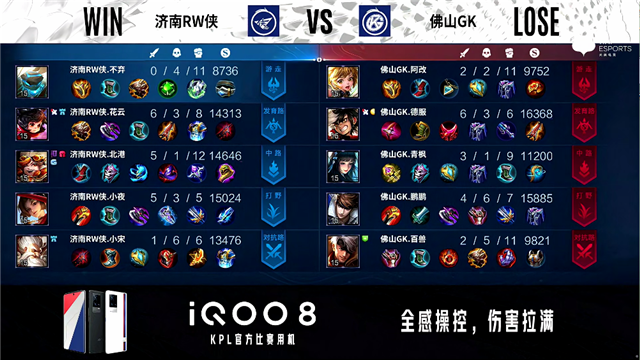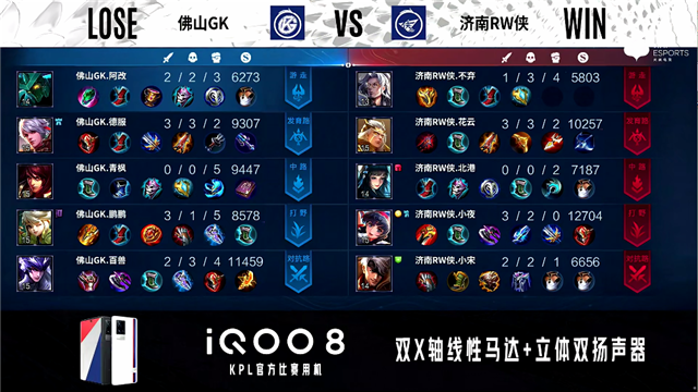 2分11秒,佛山GK控下暴君,济南RW侠控下先知主宰。5分10秒,佛山GK破掉济南RW侠上一塔。6分27秒,济南RW侠控下先知主宰,随后团战佛山GK虞姬击杀橘右京拿下一血。7分10秒,佛山GK控下暴君,随后队伍破掉济南RW侠下一塔。9分40秒,济南RW侠破掉佛山GK下二塔。10分47秒,济南RW侠控下暗影主宰,随后佛山GK控下暗影暴君。11分52秒,济南RW侠强推掉佛山GK中一塔。12分05秒,佛山GK野区击杀公孙离,随后破掉济南RW侠下二塔。13分48秒,佛山GK强破掉济南RW侠上高地。14分36秒,济南RW侠控下暗影主宰。15分53秒,济南RW侠公孙离中路反打击杀裴擒虎。16分42秒,济南RW侠破掉佛山GK中二塔。19分04秒,双方破掉对方下高地。19分31秒,济南RW侠控下暗影主宰。21分05秒,龙王团,佛山GK打出1换2。21分50秒,佛山GK控下风暴龙王,随后破掉济南RW侠中一塔。22分51秒,佛山GK破掉济南RW侠中二塔。24分钟,济南RW侠击杀王昭君,随后再击杀裴擒虎。24分50秒,济南RW侠击杀虞姬并破掉佛山GK中高地。25分08秒,济南RW侠摧毁佛山GK水晶先下一城。