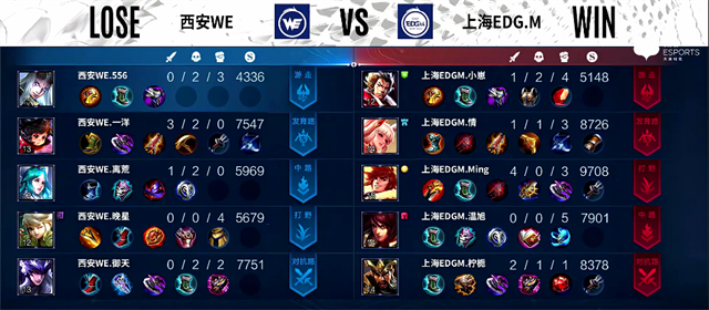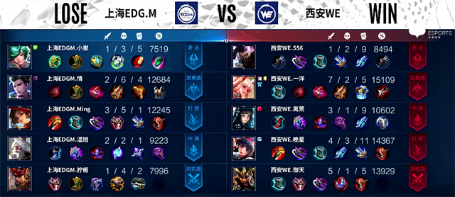 双方和平开局。2分11秒暴君团,娜可露露拿下暴君和一血,团战上海EDG.M打出0换2。5分钟黄忠推掉下路一塔。6分钟下路团战,双方1换1。6分13秒橘右京推掉下路一塔。7分钟娜可露露拿下暴君。7分15秒橘右京被击杀。8分钟上路团战,双方1换1。9分20秒中路团战,双方2换2。10分50秒黄忠推掉下路二塔,娜可露露拿下暴君。11分20秒娜可露露被击杀。12分50秒娜可露露拿下主宰。14分40秒高地团,双方1换1。15分33秒娜可露露拿下暴君。18分钟上海EDG.M推掉上路高地塔,团战双方1换1。17分钟娜可露露拿下主宰。18分30秒高地团,西安WE打出2换5团灭上海EDG.M,白起拿下三杀。19分38秒西安WE推掉水晶率先拿下赛点。