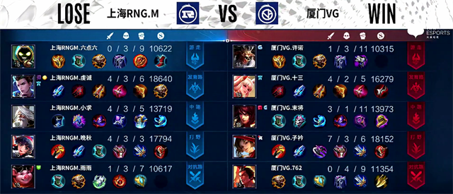 双方和平开局。2分40秒赵云拿下主宰。5分09秒虞姬推掉下路一塔。5分20秒中路团战,厦门VG打出3换4,貂蝉拿下一血。6分40秒双方互换边路一塔。7分10秒中路团战,上官婉儿被击杀。7分50秒关羽被击杀。8分17秒阿古朵被击杀,上海RNG.M推掉中路一塔。11分20秒河道团战,厦门VG打出1换3。11分56秒李元芳拿下主宰。13分钟阿古朵推掉下路二塔。13分15秒李元芳推掉中路一塔。14分15秒阿古朵拿下暴君。16分10秒河道团战,上海RNG.M打出1换2。17分40秒野区团战,厦门VG团灭上海RNG.M,貂蝉拿下五杀。18分33秒厦门VG推掉水晶拿下本场比赛胜利。