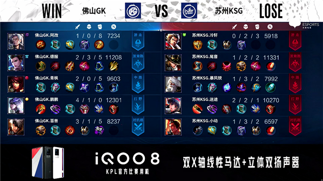 1分04秒,佛山GK猪八戒击杀夏侯惇拿下一血。2分20秒,苏州KSG拿下暴君,双方团战2换2。3分14秒,佛山GK月季下路越塔击杀公孙离。3分30秒,下路团,佛山GK打出1换2。4分钟,佛山GK下路击杀公孙离,随后苏州KSG云缨拿下先知主宰。6分24秒,佛山GK破掉苏州KSG下一塔,苏州KSG破掉佛山GK上一塔并击杀裴擒虎。7分11秒,暴君团,双方1换1。8分40秒,佛山GK团战打出0换2,随后控下先知主宰。9分18秒,佛山GK裴擒虎击杀兰陵王。9分41秒,佛山GK破掉苏州KSG上二塔。10分41秒,暴君团,佛山GK打出1换3,随后破掉苏州KSG中一塔。11分21秒,佛山GK控下暗影暴君。12分48秒,苏州KSG控下暗影主宰,佛山GK下路包抄击杀兰陵王。15分48秒,苏州KSG拿下暗影暴君,随后佛山GK击杀夏侯惇并破掉苏州KSG下二塔。16分39秒,佛山GK破掉苏州KSG中二塔。17分18秒,主宰团,佛山GK打出2换5团灭对手。17分52秒,佛山GK中路一波摧毁苏州KSG水晶先下一城。