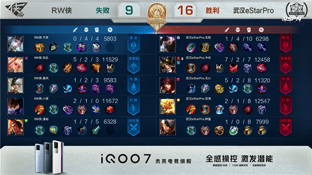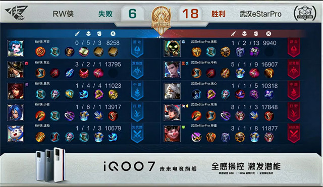 双方常规开局。55秒武汉ES入侵野区反掉红BUFF。1分53秒武汉ES关羽对抗路单杀露娜拿到一血。2分05秒武汉ES野区击杀夏侯惇。2分57秒武汉ES对抗路击杀夏侯惇。5分08秒武汉ES摧毁敌方发育路外塔。5分42秒武汉ES对抗路击杀露娜。5分59秒武汉ES中路击杀百里守约。6分27秒对抗路团战RW侠打出1换4,露娜拿到三连决胜。7分09秒双方中路1换1。8分18秒武汉ES拿下主宰。8分42秒武汉ES中路击杀张飞。9分35秒武汉ES拿下暗影暴君。10分18秒武汉ES拿下暗影主宰,RW侠拿下暗影暴君。11分03秒武汉ES摧毁敌方中路外塔。11分21秒野区团战武汉ES打出0换3。11分51秒武汉ES摧毁敌方对抗路高地塔。14分43秒RW侠抢到暗影主宰。15分10秒武汉ES中路击杀夏侯惇。15分22秒武汉ES拿下暗影暴君。15分56秒发育路双方游走互换。16分27秒RW侠对抗路击杀关羽。17分09秒RW侠摧毁敌方中路外塔。18分23秒双方高地下1换1。18分59秒RW侠拿下暗影主宰。20分28秒中路团战武汉ES打出0换3。21分05秒武汉ES摧毁敌方水晶拿下比赛。
