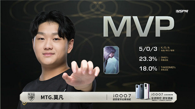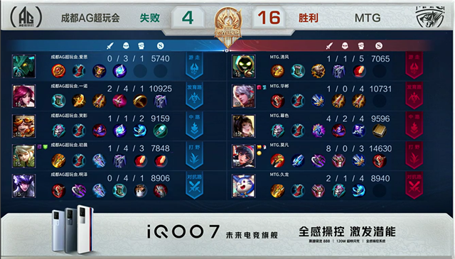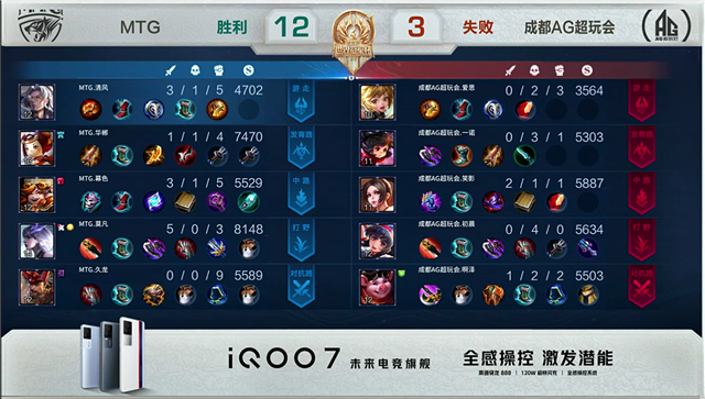 53秒,MTG不知火舞击杀嫦娥拿下一血。2分36秒,MTG拿下暴君。4分01秒,下路团,双方2换2,成都AG嫦娥拿下双杀。5分35秒,成都AG下路越塔打出0换3。7分22秒,MTG击杀兰陵王。7分35秒,下路团,MTG打出1换2。8分45秒,下路团,MTG打出0换4。9分01秒,MTG破掉成都AG下二塔。9分50秒,双方团战1换1。10分58秒,野区团,MTG打出2换3。12分24秒,MTG拿下暗影暴君,随后破掉成都AG中二塔。12分45秒,中路团,MTG打出1换4并破掉成都AG中高地。13分17秒,MTG团灭对手后破掉成都AG水晶赢下比赛。
