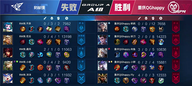 开局RW侠入侵野区拿下蓝Buff。1分10秒RW侠再次入侵野区,娜可露露拿下一血,团战RW侠打出1换1。2分钟镜在上路击杀夏侯惇。2分30秒嫦娥拿下暴君。3分35秒镜拿下主宰。4分35秒镜单杀不知火舞。5分20秒镜被击杀。6分钟重庆QGhappy推掉上路一塔。6分55秒上路团战,双方1换1,RW侠推掉上路一塔。7分20秒镜拿下暴君。7分56秒RW侠推掉中路一塔。9分09秒RW侠推掉下路二塔。10分55秒下路团战,猪八戒被击杀。12分20秒中路团战,重庆QGhappy打出0换4,孙尚香拿下三杀。13分钟RW侠上路高地塔被破。13分50秒重庆QGhappy推掉中路一塔。14分57秒娜可露露拿下暴君。15分38秒中路团战, 重庆QGhappy打出1换3,孙尚香拿下双杀。16分02秒孙尚香直上高地推掉上水晶拿下本场比赛胜利。
