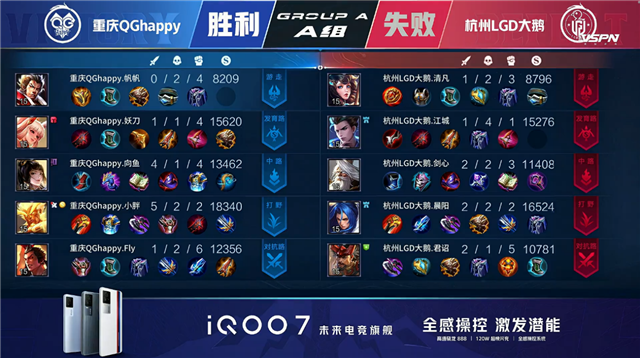 双方常规开局,2分01秒上路杭州LGD大鹅打出0换2。2分51秒重庆QG拿下暴君。3分53秒重庆QG中路击杀橘右京。4分09秒杭州LGD大鹅下路狄仁杰反杀盘古。5分46秒双方互换边路外塔。6分05秒重庆QG拿下主宰。6分32秒野区团战重庆QG打出0换2。6分59秒杭州LGD大鹅中路打出1换2。7分49秒重庆QG野区击杀狄仁杰。11分51秒杭州LGD大鹅拿下暗影暴君。13分14秒杭州LGD大鹅摧毁敌方中路外塔。13分44秒中路团战重庆QG打出1换3。16分26秒杭州LGD大鹅摧毁敌方上路高地塔。19分39秒杭州LGD大鹅野区击杀公孙离。20分30秒重庆QG抢下风暴龙王并打出0换3。20分57秒重庆QG摧毁敌方中路高地塔。21分13秒重庆QG摧毁敌方水晶拿下比赛。