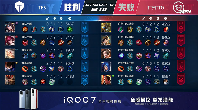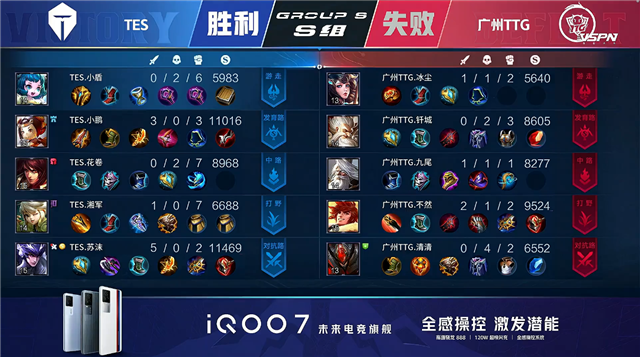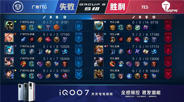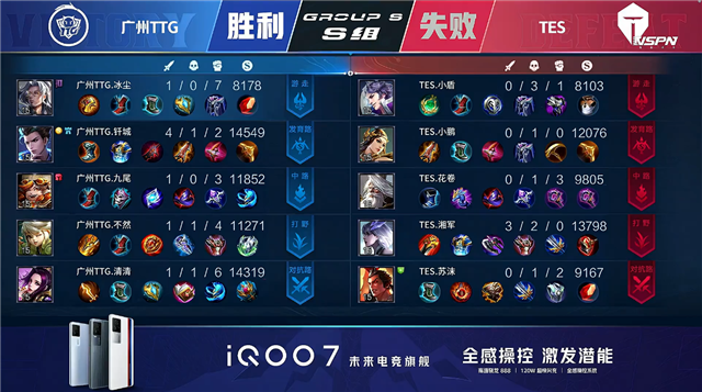 双方常规开局。56秒TES反掉敌方蓝BUFF。1分21秒广州TTG野区击杀周瑜拿到一血。3分21秒TES马超上路单杀白起。3分33秒TES阿古朵上路单杀姜子牙。5分14秒广州TTG摧毁敌方上路外塔。5分31秒TES摧毁敌方中路外塔。7分13秒TES野区击杀白起。7分21秒TES摧毁敌方中路二塔。8分06秒TES摧毁敌方下路二塔。8分30秒上路团战双方1换1。9分25秒野区团战广州TTG击杀蔡文姬。10分56秒广州TTG摧毁敌方上路二塔。12分整TES拿下暗影主宰。12分18秒TES下路打出0换2。12分59秒TES击杀大乔并摧毁敌方下路高地塔。13分16秒TESUC一会地方中路高地塔。13分24秒高地团战TES打出0换2。13分40秒TES摧毁敌方水晶拿下比赛。