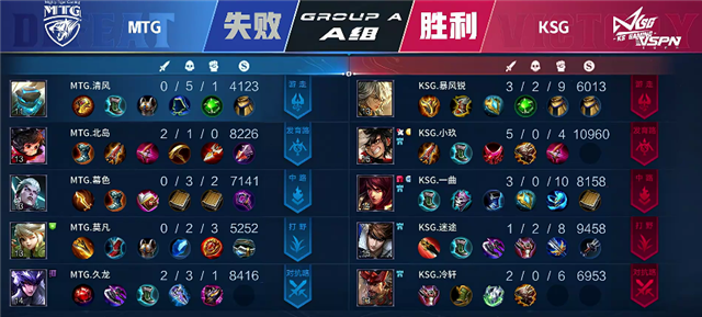 开局MTG入侵红区,兰陵王拿下红Buff。2分14秒兰陵王拿下暴君。2分30秒MTG入侵野区,廉颇拿下一血。3分20秒廉颇击杀黄忠。3分40秒MTG推掉下路一塔。4分10秒MTG推掉上路一塔。5分25秒廉颇推掉下路二塔。6分45秒大乔被击杀。7分17秒野区团战,双方打出1换1。7分30秒MTG拿下暴君。7分45秒公孙离被击杀。8分16秒上河道团战,双方打出1换1。9分钟廉颇推掉中路一塔。9分15秒兰陵王拿下主宰。1分30秒兰陵王拿下暴君。12分钟兰陵王被击杀。14分10秒公孙离拿下主宰。14分30秒KSG推掉下路一塔。14分50秒KSG带线被包,不知火舞和娜可露露被击杀,公孙离拿下双杀。15分20秒MTG推掉上路高地塔。16分40秒MTG强攻下路高地塔,廉颇被击杀,同时兰陵王被娜可露露单杀。17分30秒KSG拿下暴君。18分10秒廉颇被击杀。18分50秒主宰团,沈梦溪抢到主宰,团战双方打出1换1。22分40秒风暴龙王团,团战MTG打出2换3,公孙离拿下双杀,兰陵王拿下龙王。23分40秒MTG推掉下路高地塔。24分19秒MTG推掉中路高地塔。25分钟高地团战,MTG打出1换2。26分钟MTG攻破水晶率先拿到赛点。