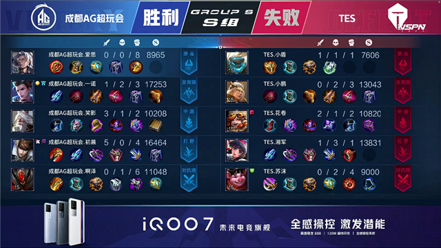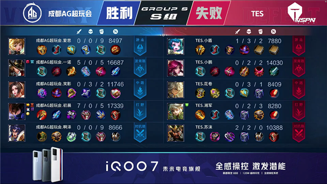 50秒TES虞姬击杀吕布拿下一血,2分11秒成都AG拿下先知主宰,4分钟成都AG拆掉TES下路一塔,4分22秒成都AG拿下暴君。5分钟团战成都AG打出1换2,6分20秒成都AG百里守约被击杀,下路团双方1换1。8分17秒TES拿下暴君,兰陵王被击杀,8分40秒成都AG百里守约击杀不知火舞。9分15秒TES中路一塔被破,10分20秒下路团双方1换1。11分14秒成都AG吕布被击杀,11分30秒TES拿下暗影暴君,成都AG拿下暗影主宰。13分37秒TES上路二塔被破,14分35秒成都AG拆掉TES中路二塔。15分50秒成都AG拿下暗影暴君,17分03秒成都AG打出0换2拆掉TES中下路高地,一波拆掉水晶拿下胜利。