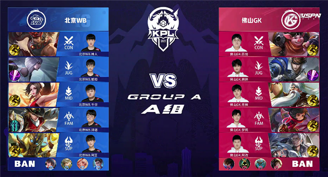 双方平稳开局。1分10秒廉颇入侵野区拿下红buff。2分25秒镜拿下暴君。3分钟廉颇入侵野区再次抢下红buff。4分10秒镜拿下主宰。4分50秒北京WB入侵野区,镜拿下一血。5分45秒北京WB强攻上路一塔,镜拿下双杀,佛山GK一塔被破。6分50秒下河道团战,佛山GK打出0换2。7分31秒佛山GK下路一塔被破。9分35秒北京WB强攻下路二塔,团战打出1换1。9分54秒北京WB推掉中一塔。11分钟镜拿下暴君。12分23秒野区团战,鬼谷子被击杀,镜拿下主宰。14分10秒北京WB推掉中路二塔。15分12秒镜拿下暴君。16分53秒镜拿下主宰。17分23秒北京WB强攻上路高地塔,不知火舞被击杀。18分15秒上河道团战北京WB打出0换3。北京WB顺势强攻高地,19分10秒北京WB攻破水晶追平比分。
